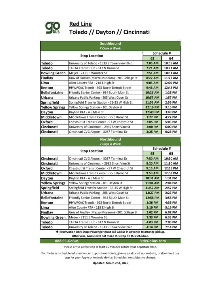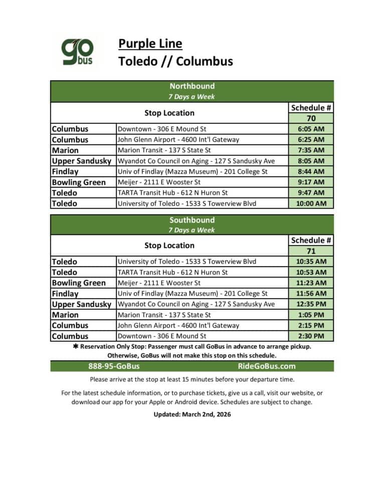 Findlay is on two separate routes – one from Columbus to Toledo (Purple) and one from Toledo to Springfield (Red). Times are available on the GoBus website.