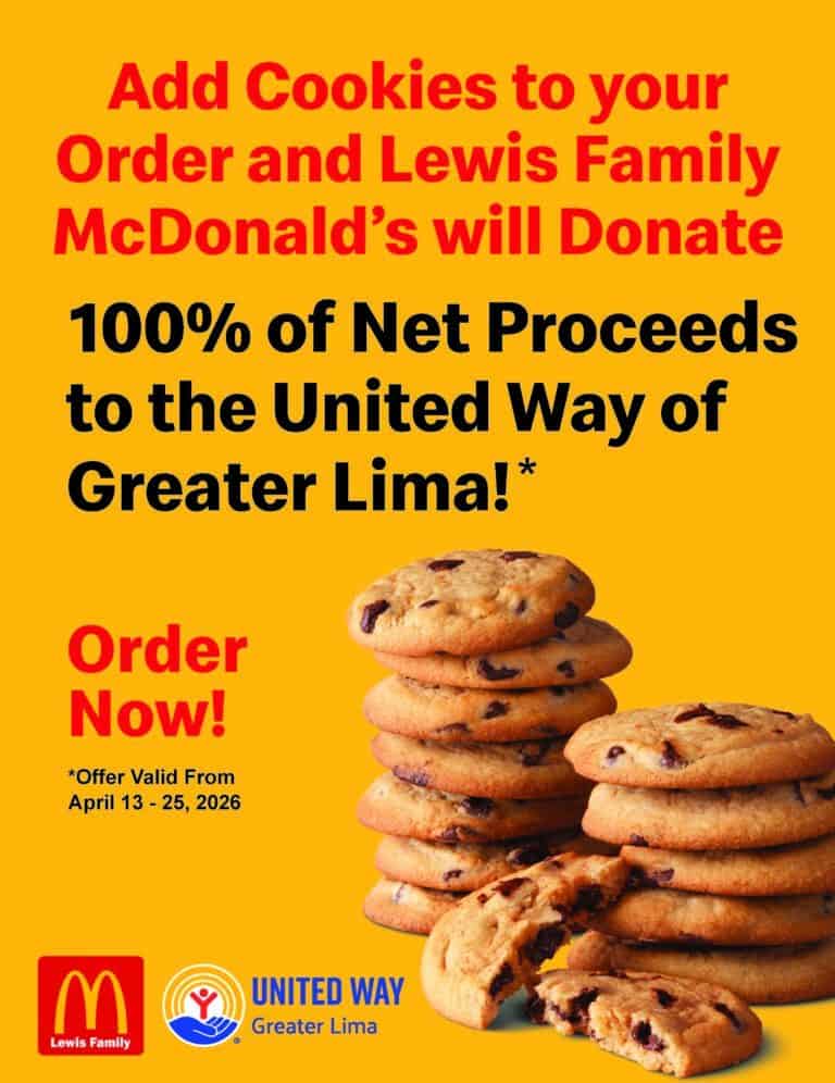 From April 13 through April 25th, add cookies to your order at your Lima area McDonald’s and help the United Way of Greater Lima!